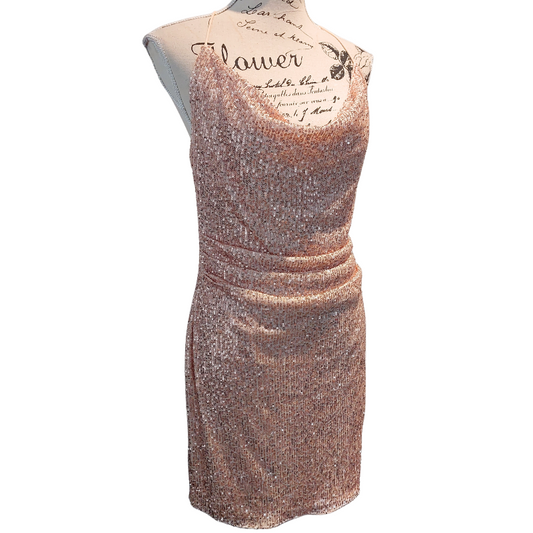 Rust silky formal dress + champagne sequin coat, size 16-18