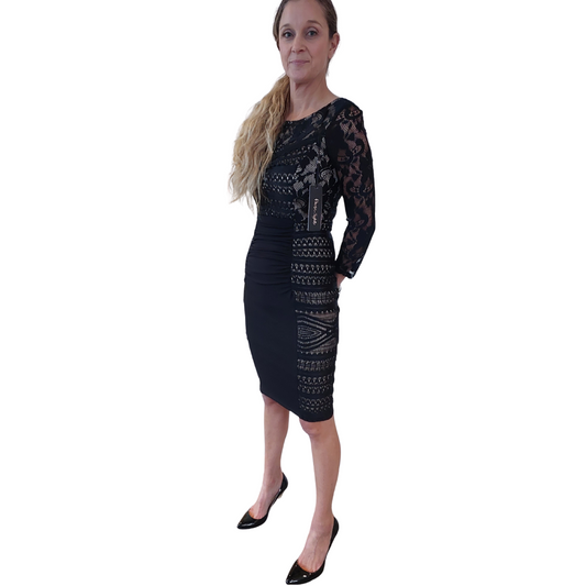 FRANK LYMAN Designer black tassel dress, size 10, HIRE