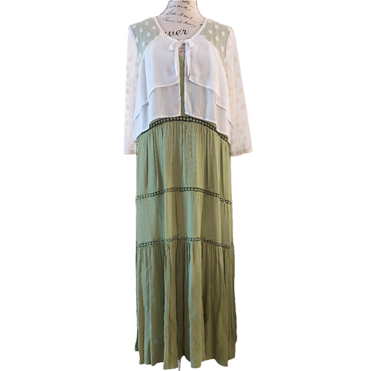 Catalyst cream top + Loobies Story avocado green dress, size 14