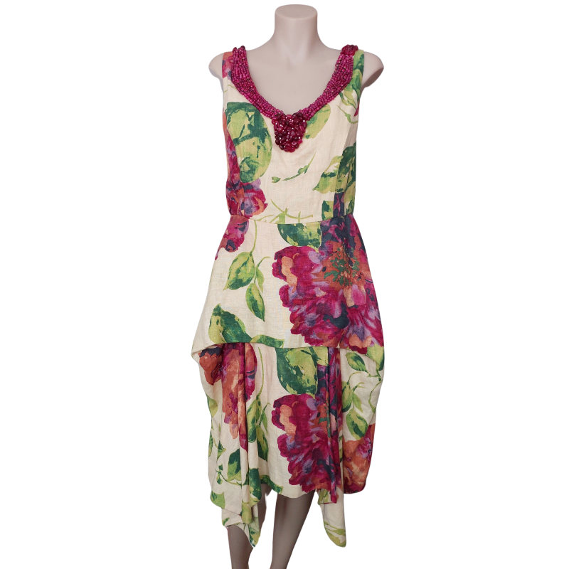 Lovely floral print linen beaded dress by famed New Zealand designer Trelise Cooper. This dress has unique cut and vibrant colors. Beaded neck of stones
