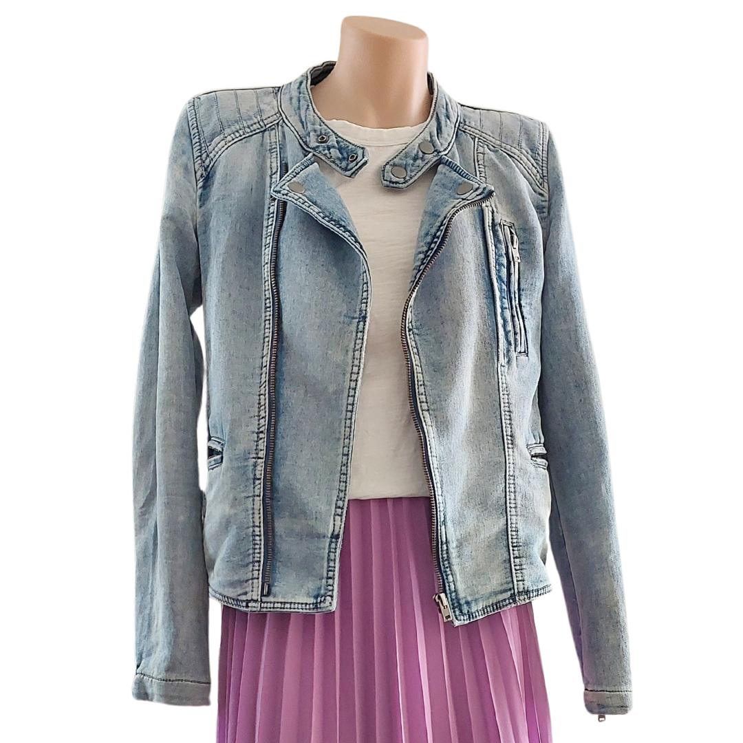 Decjuba blue distressed denim jacket, size 8